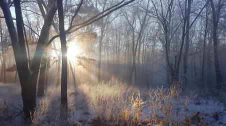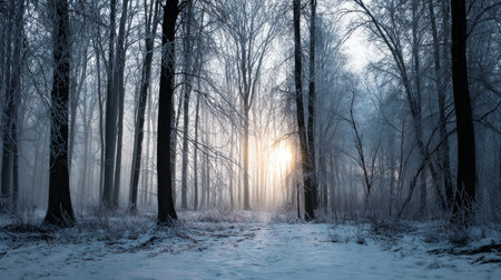 Tranquil winter morning in the frosty forest with sunlight peeking through the trees at sunrise
