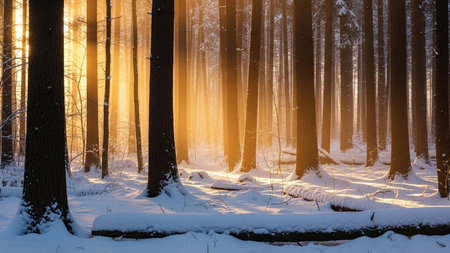 A winter forest scene bathed in the warm glow of golden hour sunlight. Tall trees stand covered in a thick blanket of snow, their branches casting long, dramatic shadows across the frosted ground. Sunbeams pierce through the canopy, creating an ethereal and magical atmosphere, illuminating the tranquil woodland with a serene and peaceful light. captures the quiet beauty of nature during a cold, frosty season.
