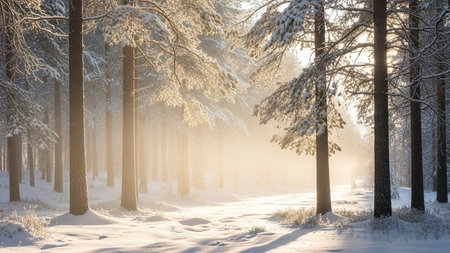 A serene winter forest scene bathed in soft, ethereal sunlight filtering through snow-laden pine trees. Gentle mist hangs in the air, creating a diffused glow and casting long shadows across the snow-covered ground. The captures a tranquil and peaceful atmosphere, highlighting the natural beauty of a frosty woodland. The light rays pierce through the branches, illuminating the scene with a warm, inviting radiance despite the cold.