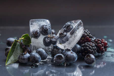 Fresh yellow barberry flower frozen in ice on dark background for summer drinks. Creative texture.