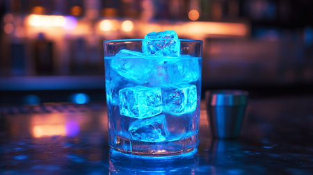 Five glass goblets on a long twisted legs with ice cubes glowing in different colors. Fun and bright drinks with luminous led elements are located on a black matte background, party and relaxation.