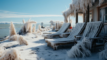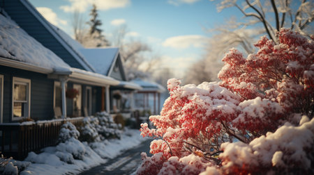 snow-covered streets create a picturesque coastal scenery, with a light sky-blue and white palette. this national geographic photo captures the stunning coastal views, enhanced by vignetting. the spectacular backdrops, shot with the hasselblad h6d-400c, transport viewers to a winter wonderland. ai generated