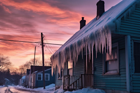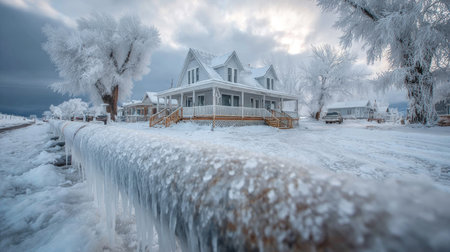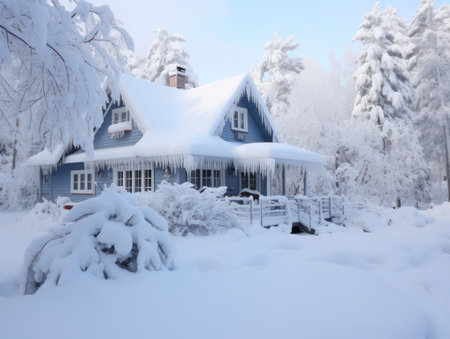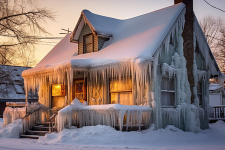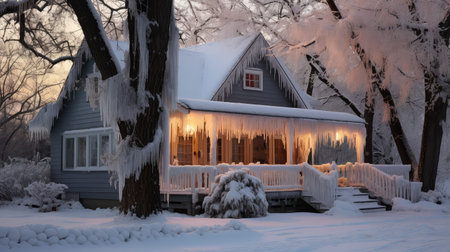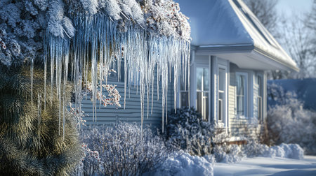 serene beauty of a house with icicles hanging from the roof, surrounded by a winter wonderland.