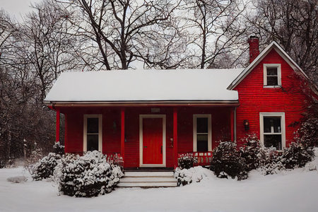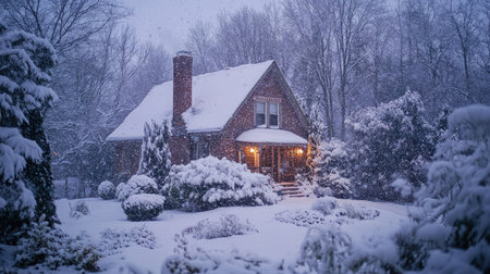 A charming house blanketed in fresh snow stands peacefully in a winter landscape. Warm lights illuminate the windows, creating a cozy atmosphere amidst towering trees.