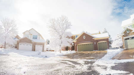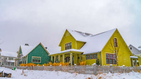 Panorama Appealing homes amid an icy landscape on a cloudy winter day in Daybreak. The houses are surrounded by low picket fences capped with snow.