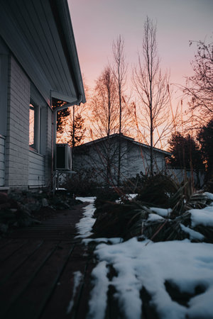 Sunrise pink sky behind trees next to house in Rovaniemi, Lapland