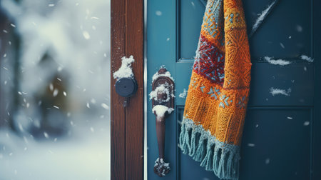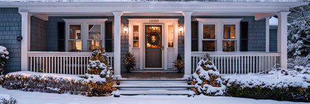 A charming winter home entrance featuring a decorative wreath and glowing lights, surrounded by snow and flurries, evoking a warm holiday atmosphere perfect for the festive season.