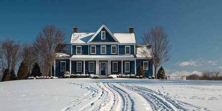 Clear Vertical Exterior of an elegant house against blue sky with puffy clouds in winter