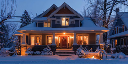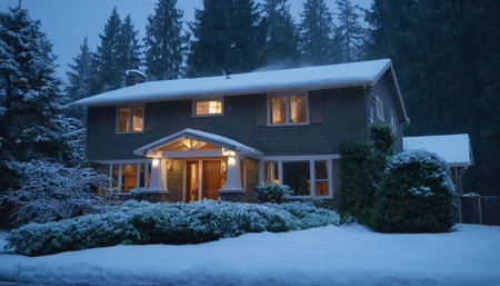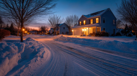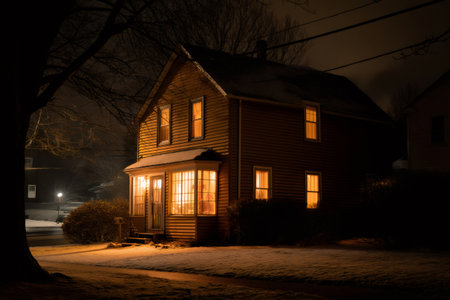 Warm lights glowing through windows of a cozy house on a chilly winter night, creating a welcoming atmosphere in a snowy neighborhood