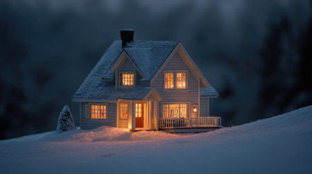 This image features a cozy house model illuminated by warm lights, surrounded by a serene blanket of snow, capturing the peaceful ambiance of a winter evening.