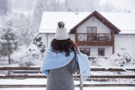 winter vacation woman outdoors in snow. woman standing by house in snow