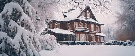 A winter landscape with a snow-covered house, fir trees and the sky. Panoramic snow-covered natural scene. The house is in the snow.
