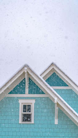 Clear Vertical Vertical Snow falling on a blue home in Daybreak Utah with cloudy sky in the background