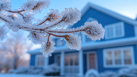A beautiful tree covered in ice crystals, the sky is blue and clear, it's winter outside, and there's an elegant villa with gabled windows. The photo was taken from directly below, capturing every detail of each leaf on that tree, creating a stunning visual effect. This is an ultra-realistic photograph captured by a Sony Alpha A7 III camera using a wide-angle macro lens. It showcases the enchanting beauty of nature. --ar 53:30 --stylize 750 --v 6.1 Job ID: 70c1ec5d-9924-4036-844d-a59d6f0e5709