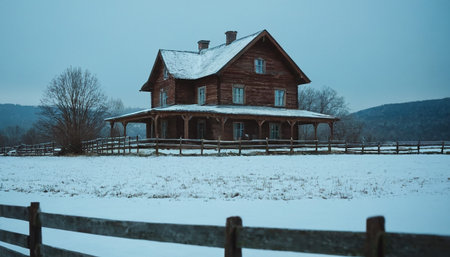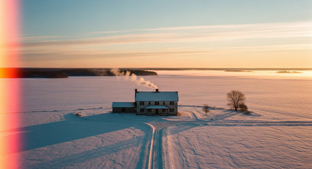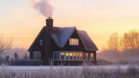 Cozy rural home with chimney smoke and frosty grass during early winter sunrise