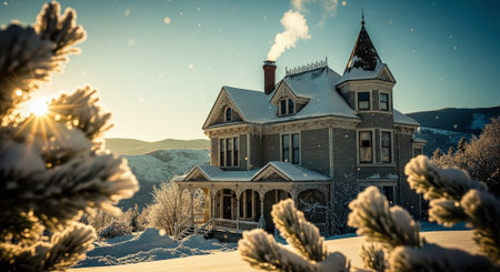 A picturesque Victorian house covered in snow, with smoke rising from the chimney, surrounded by snow-covered trees and mountains in the background, illuminated by sunlight