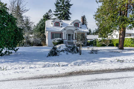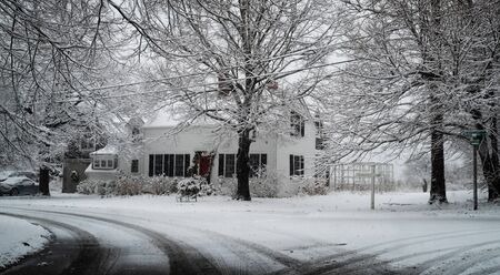 A snow-covered street lined with houses and trees, creating a wintry scene in a residential neighborhood.