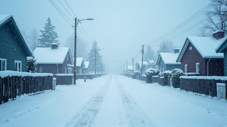 A heavy snowstorm covering houses and roads, visibility reduced to almost zero.