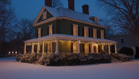 A charming green colonial house is covered in snow and decorated with twinkling lights on its porch and railings during a winter twilight.