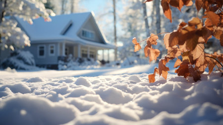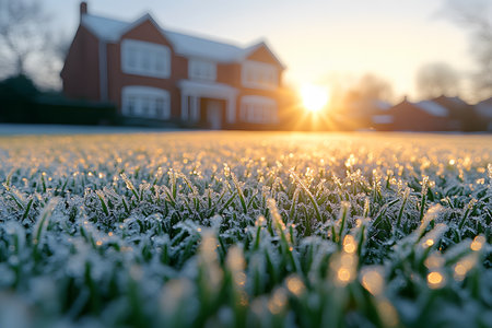 Frost-covered grass glistens in the early morning light as the sun rises behind a suburban house. the warm glow contrasts with the cold frost, creating a serene and picturesque winter scene in a neighborhood setting. Generative AI