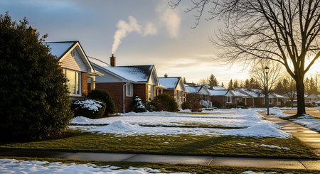 A scenic suburban street is blanketed in snow at sunrise, with warm light casting long shadows on the road. Smoke rises from the chimneys of brick houses, creating a picturesque and peaceful winter landscape.