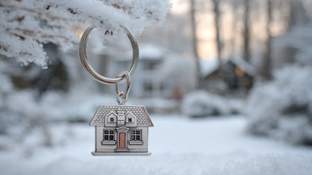 A silver keychain with a house charm hangs from a branch covered in snow. The background shows a wintry scene with soft light at dusk evoking feelings of warmth and comfort.
