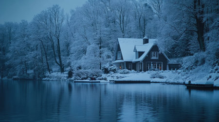 A tranquil winter scene featuring a cozy cottage by a calm frozen lake, surrounded by snow-covered trees. The peaceful atmosphere captures the essence of a serene getaway.