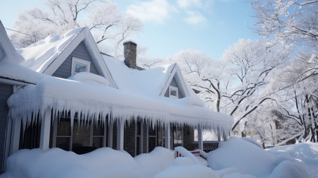 icicles hanging from a roof under a snowy sky, created with generative ai