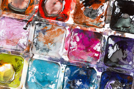 Close up of messy water color paint box, isolated on white.
