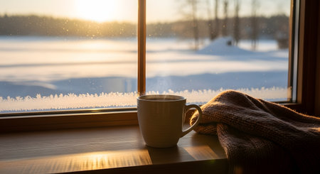 A steaming mug of hot beverage sits on a wooden windowsill next to a folded brown knitted sweater, overlooking a snowy winter landscape. The golden hour sunset light illuminates the steam and the frost on the windowpane, creating a cozy and peaceful atmosphere. Outside, a frozen lake and snow-covered trees complete the serene winter scene.