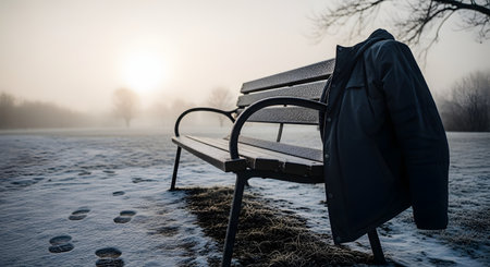 A wooden park bench sits empty in a frost-covered field during a foggy winter sunrise, with a dark jacket hanging over the armrest. Footprints are visible in the frozen grass leading away from the bench, adding a sense of mystery and solitude to the scene.