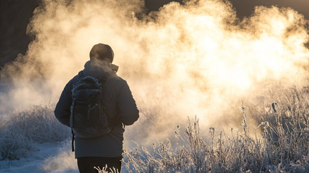A lone figure gazes at the breathtaking sunrise over a frozen expanse, enveloped in a misty atmosphere. The early morning light creates a serene ambiance.