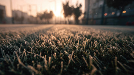 A serene view of morning dew glistening on fresh green grass in a sports field. The soft sunlight creates a warm glow, offering a peaceful start to the day.