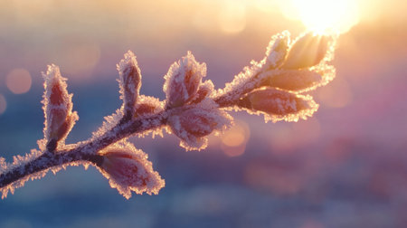 Captivating view of frosty branches against a serene winter landscape at sunrise. This image captures the beauty of nature during the cold season.
