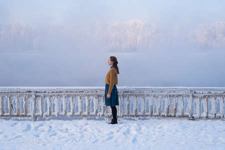 Young woman in a dress and sweater is standing near the frozen fence in winter.