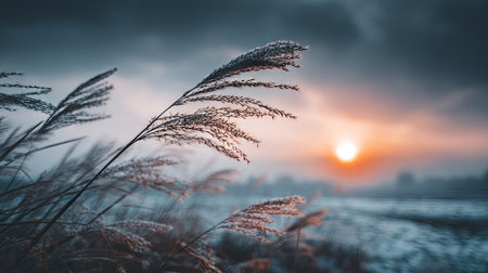 Winter Beautiful Christmas landscape, snow reed against a sunset, Shallow depth-of-field