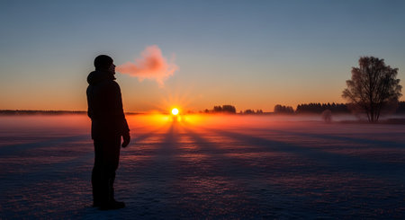 A silhouette of a person standing in a snowy field at sunrise, with a visible cloud of breath vapor indicating the freezing cold temperature. The golden sun bursts on the horizon, casting long shadows across the frost-covered landscape.