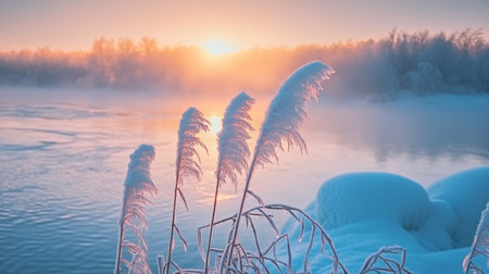 Beautiful Frozen Winter Landscape at Sunrise with Misty River and Snowy Reeds Reflecting Light