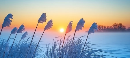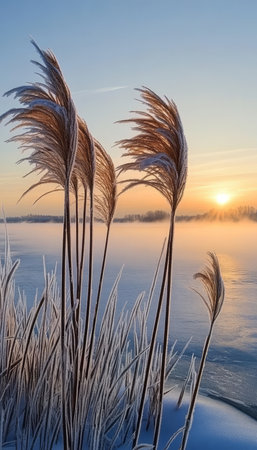 Winter Sunrise over Frozen River with Frosted Reeds, Capturing the Tranquil Morning Light