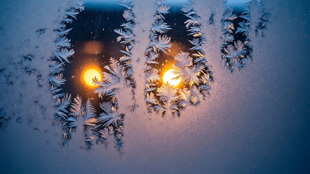 Frost patterns decorate a window, blurring amber lights from outside during a cold evening, creating a cozy and inviting atmosphere.