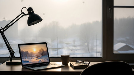 Laptop computer on a table with a cup of coffee on the background of a winter landscape