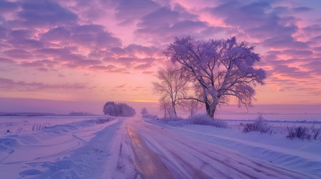 A breathtaking winter landscape featuring a snowy road lined with frosty trees under a colorful sunrise. The serene atmosphere creates a perfect scene for nature lovers.