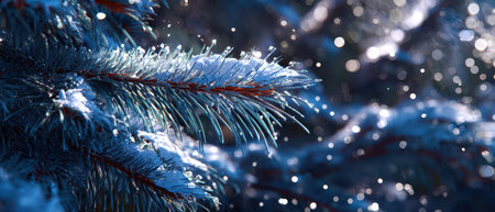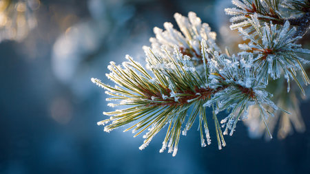 Pine branch with frozen needles reflecting sunlight, showing winter nature and cold