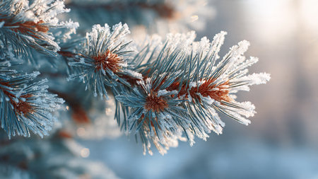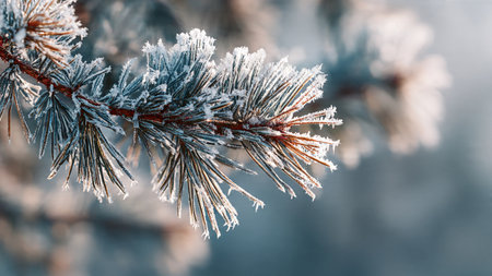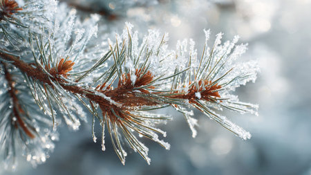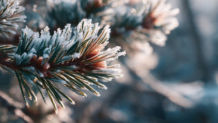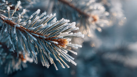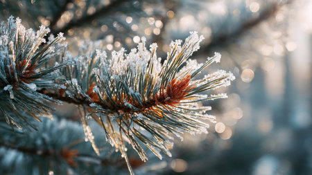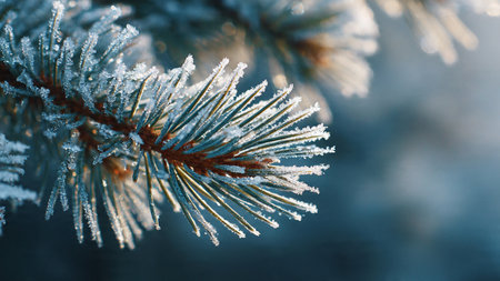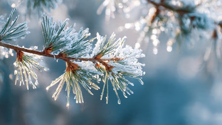 Close-up of frosty pine needles glistening with water droplets on a winter's morning