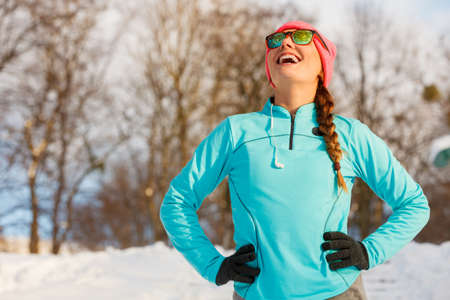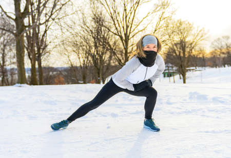 Sports and activities in winter time. Slim fit fitness woman outdoor. Athlete girl training wearing warm sporty clothes outside in cold snow weather.