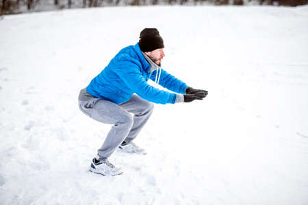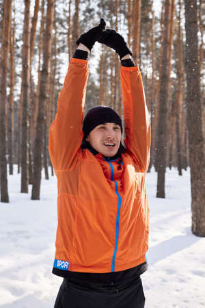 Portrait of a man stretching in the park on a beautiful snowy winter day