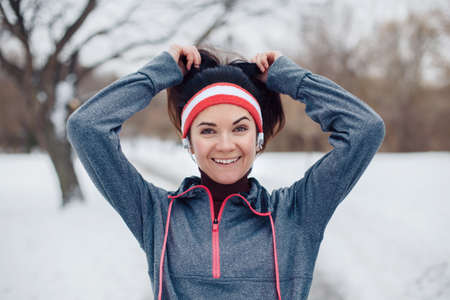 Portrait of Caucasian young woman jogging outside in winter park. Girl running outdoors wearing sportswear, headband and headphones. Exercising person female in street.