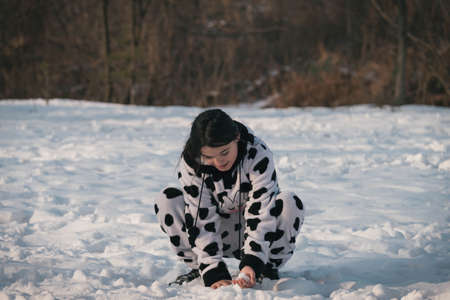 Cute girl in winter snow playground with cow outfit