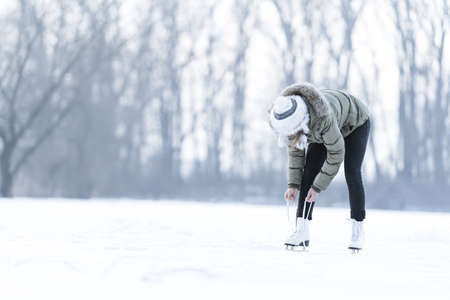tying the laces of winter skates on a frozen lake, ice skating