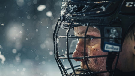 A closeup of a hockey players helmet with scratches and marks from intense gameplay
